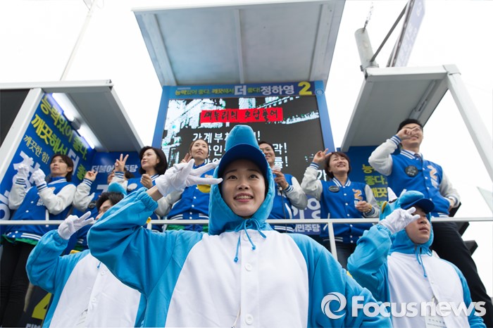(김포=포커스뉴스) 8일 오후 경기 김포 장기사거리에서 정하영 김포시을 후보 선거운동원들이 지지를 호소하고 있다.