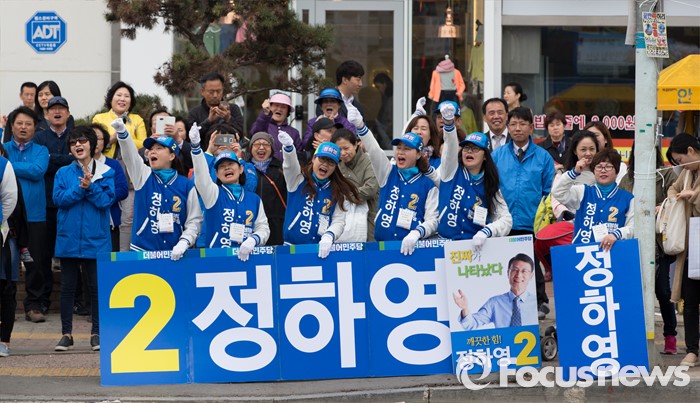 (김포=포커스뉴스) 8일 오후 경기 김포 장기사거리에서 정하영 김포시을 후보 선거운동원들이 지지를 호소하고 있다.