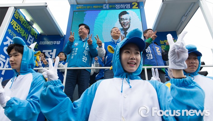 (김포=포커스뉴스) 김종인 더불어민주당 비대위 대표 겸 선대위원장이 8일 오후 경기 김포 장기사거리에서 김두관 김포시갑 후보와 정하영 김포시을 후보 합동지원유세를 하고 있다.