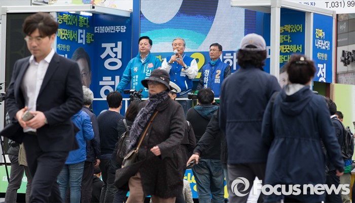 (김포=포커스뉴스) 김종인 더불어민주당 비대위 대표 겸 선대위원장이 8일 오후 경기 김포 장기사거리에서 김두관 김포시갑 후보와 정하영 김포시을 후보 합동지원유세를 하고 있다.