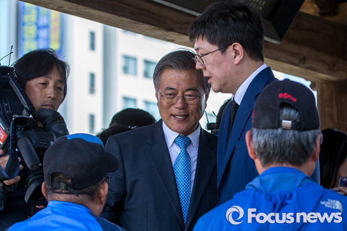 (광주=포커스뉴스) 문재인 더불어민주당 전 대표와 김홍걸 국민통합위원장이 8일 오후 광주시 서구 광주공원 앞에서 주민들과 대화를 나누고 있다.