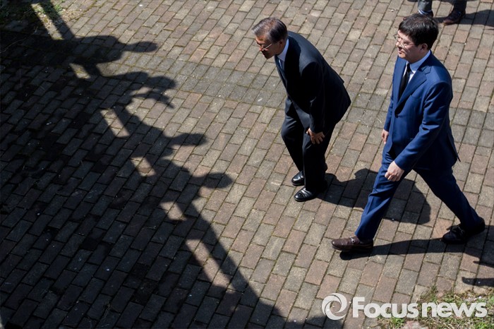 (광주=포커스뉴스) 문재인(왼쪽) 더불어민주당 전 대표와 김홍걸 국민통합위원장이 8일 오후 광주시 서구 광주천일대를 거닐며 지역주민들과 인사 하고 있다.