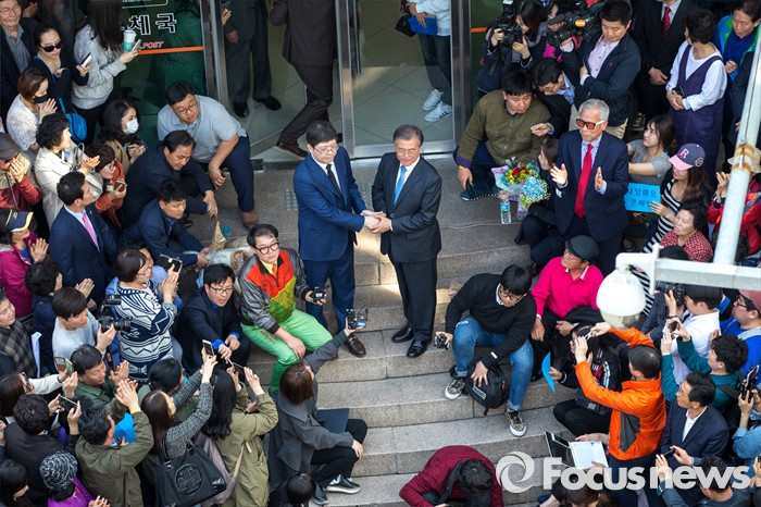 (광주=포커스뉴스) 김홍걸 국민통합위원장이 8일 오후 광주광역시 동구 충장로에서 시민들에게 "문재인 전 대표 아버지(故 김대중 전 대통령) 배신하지않았다"는 입장을 밝힌 뒤 문 전 대표와 악수 하고 있다.
