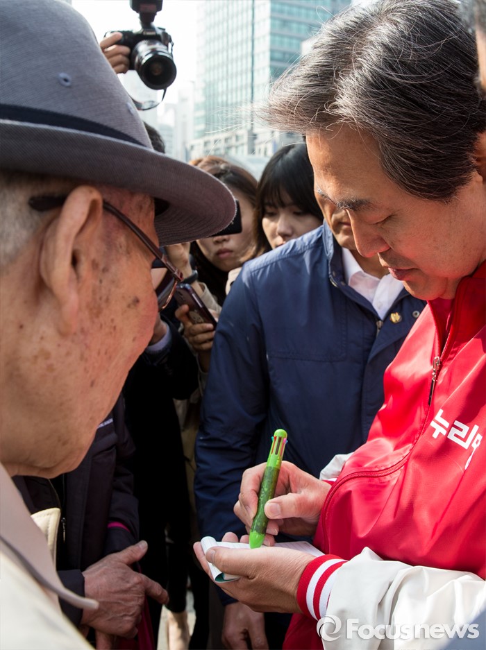 (고양=포커스뉴스) 8일 오후 경기 고양시 화정역 광장에서 손범규 새누리당 고양갑, 김태원 고양을 후보 합동지원유세를 가진 김무성 대표가 지지자들에게 사인을 해주고 있다.
