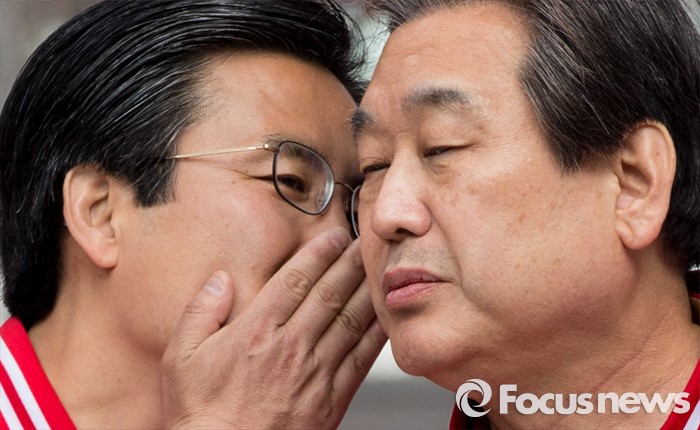 (고양=포커스뉴스) 8일 오후 경기 고양시 화정역 광장에서 손범규 새누리당 고양갑, 김태원 고양을 후보 합동지원유세를 가진 김무성 대표가 손 후보와 귀엣말을 하고 있다.