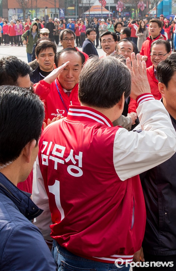 (고양=포커스뉴스) 8일 오후 경기 고양시 화정역 광장에서 손범규 새누리당 고양갑, 김태원 고양을 후보 합동지원유세를 가진 김무성 대표가 지지자들과 인사하고 있다.