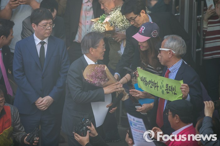 | △ 지지자에게 꽃다발 받는 문재인 전 대표 |