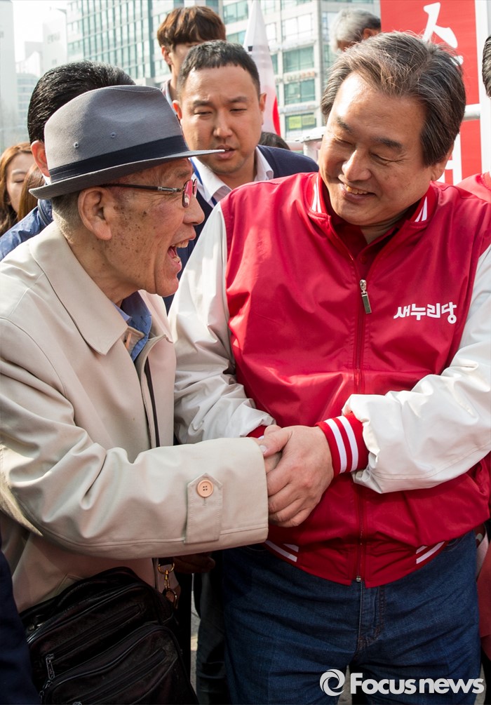 (고양=포커스뉴스) 8일 오후 경기 고양시 화정역 광장에서 손범규 새누리당 고양갑, 김태원 고양을 후보 합동지원유세를 가진 김무성 대표가 지지자와 악수하고 있다.
