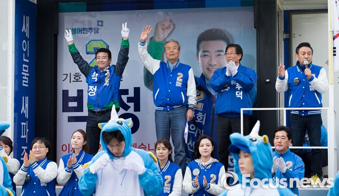 (파주=포커스뉴스) 김종인 (왼쪽 두번째) 더불어민주당 비대위 대표 겸 선대위원장이 8일 오후 경기 파주 금촌역 앞에서 윤후덕(오른쪽 두번째) 파주시갑 후보와 박정(왼쪽) 파주시을 후보 합동지원유세를 하고 있다.