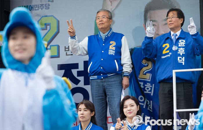 (파주=포커스뉴스) 김종인(왼쪽) 더불어민주당 비대위 대표 겸 선대위원장이 8일 오후 경기 파주 금촌역 앞에서 윤후덕 파주시갑 후보 합동지원유세를 하고 있다.