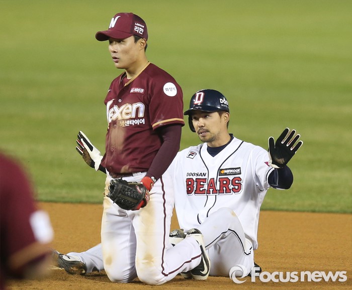 (서울=포커스뉴스) 8일 서울 잠실구장에서 열린 2016 프로야구 넥센-두산 경기 6회말 볼넷으로 진루한 두산 오재원이 오재일 타석때 넥센 투수 오재영의 견제구에 걸렸으나 1루수 채태인의 송구 실책으로 2루에서 세이프되고 있다. 앞은 넥센 유격수 김하성.