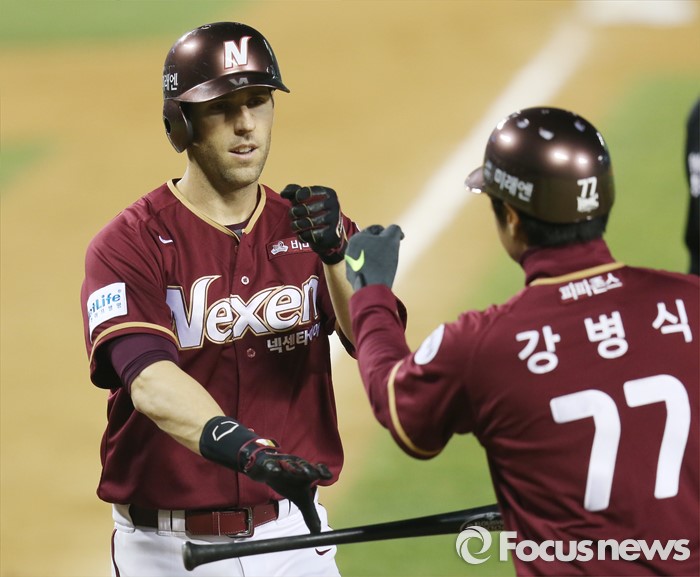 (서울=포커스뉴스) 8일 서울 잠실구장에서 열린 2016 프로야구 넥센-두산 경기 7회초 넥센 선두타자 대니 돈이 우월 1점 홈런을 치고 홈인하며 강병식 코치의 환영을 받고 있다.
