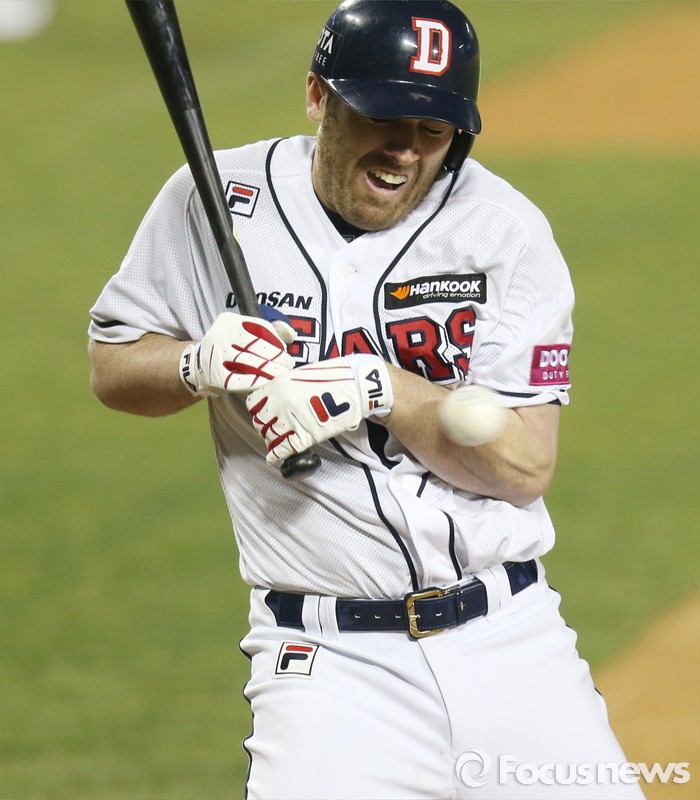 (서울=포커스뉴스) 8일 서울 잠실구장에서 열린 2016 프로야구 넥센-두산 경기 7회말 2사 2루에서 두산 에반스가 넥센 투수 김정훈의 투구에 왼쪽 팔뚝을 맞고 있다.