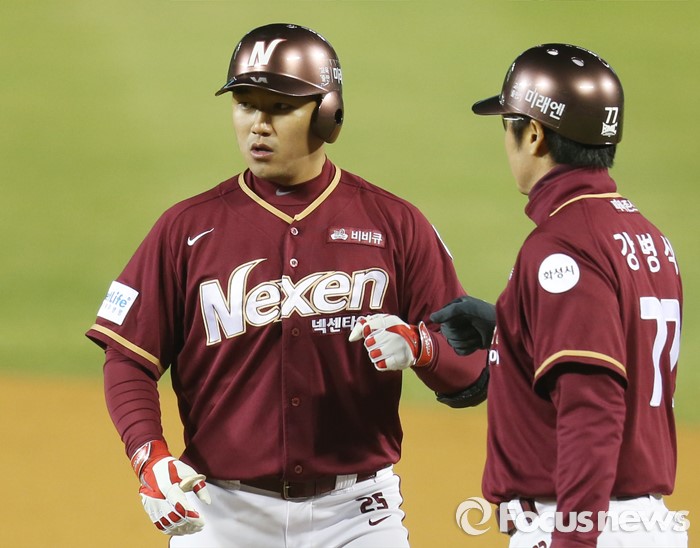 (서울=포커스뉴스) 8일 서울 잠실구장에서 열린 2016 프로야구 넥센-두산 경기 8회초 2사 2루에서 넥센 대타 홍성갑이 우익수 앞 안타를 치고 1루에서 강병식 코치와 주먹을 마주치고 있다.