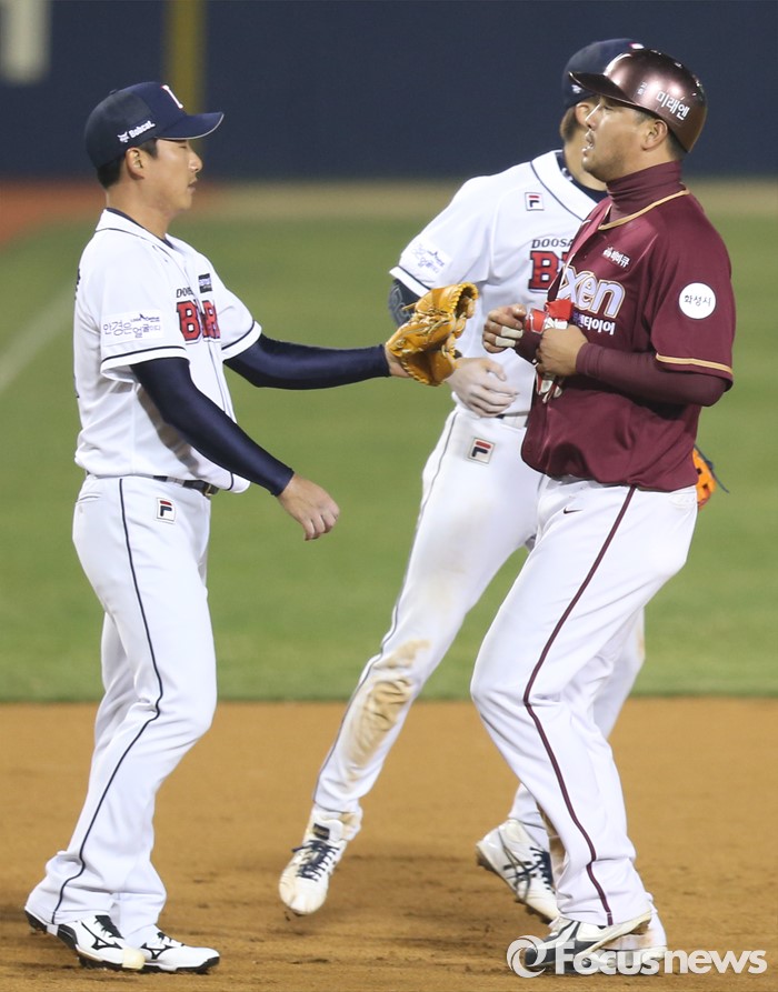 (서울=포커스뉴스) 8일 서울 잠실구장에서 열린 2016 프로야구 넥센-두산 경기 7회초 1사 2루에서 넥센 박동원의 1루 땅볼때 2루주자 채태인이 협살에 걸려 3루에서 정재훈에게 아웃되고 있다.