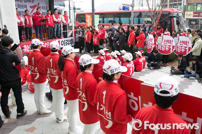 (원주=포커스뉴스) 제20대 국회의원 선거를 나흘 앞둔 9일 오전 강원도 원주시 치악로 남부시장 앞에서 김무성(단상 가운데) 새누리당 대표가 김기선 원주갑, 이강후 원주을 후보 지원유세를 하고 있다.