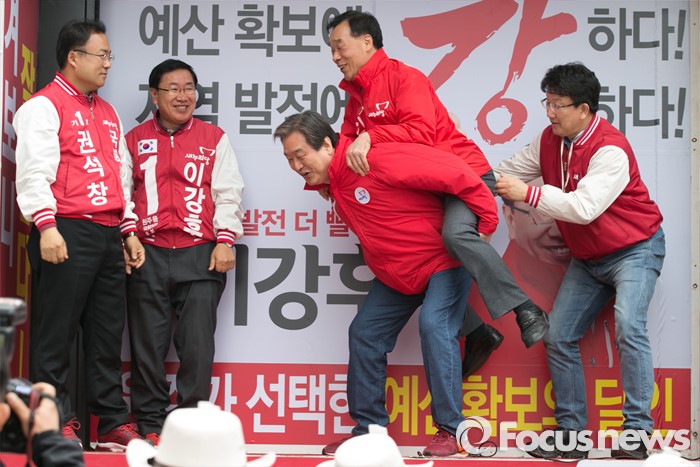 (원주=포커스뉴스) 제20대 국회의원 선거를 나흘 앞둔 9일 오전 강원도 원주시 치악로 남부시장 앞에서 김무성(가운데) 새누리당 대표가 김기선(오른쪽 두번째) 원주갑, 이강후(왼쪽 두번째) 원주을 후보 지원유세에 참석해, 김 후보를 업고 있다.