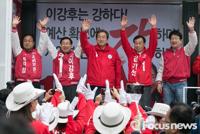 (원주=포커스뉴스) 제20대 국회의원 선거를 나흘 앞둔 9일 오전 강원도 원주시 치악로 남부시장 앞에서 김무성(가운데) 새누리당 대표가 김기선(오른쪽 두번재) 원주갑, 이강후(왼쪽 두번째) 원주을 후보 지원유세를 하고 있다.