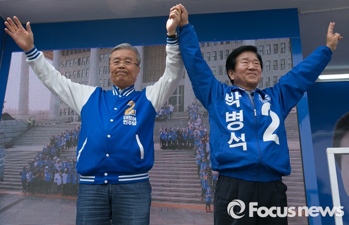 (대전=포커스뉴스) 9일 오후 대전 서구 도마네거리에서 김종인(왼쪽) 더불어민주당 비대위 대표 겸 선대위원장과 박병석 대전서구갑 후보가 선거유세를 하며 지지를 호소하고 있다.