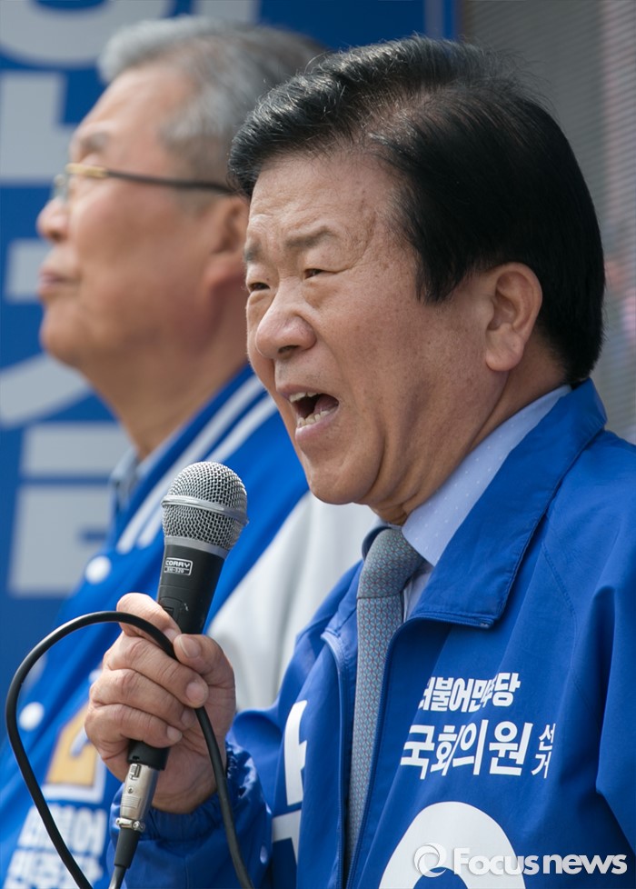 (대전=포커스뉴스) 9일 오후 대전 서구 도마네거리에서 박병석 더불어민주당 대전서구갑 후보가 선거유세를 하며 지지를 호소하고 있다. 왼쪽은 김종인 비대위 대표 겸 선대위원장.