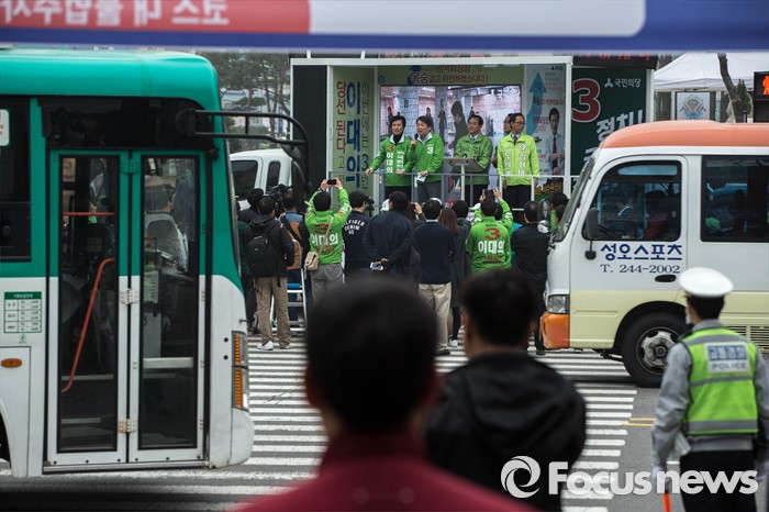 (수원=포커스뉴스) 9일 오후 수원시 장안구 수원종합운동장에서 열린 국민의당 합동유세에 참석한 안철수 대표가 시민들을 향해 지지를 호소하고 있다.