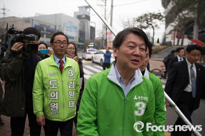 (수원=포커스뉴스) 9일 오후 수원시 장안구 수원종합운동장에서 열린 국민의당 합동유세에 참석한 안철수 대표가 후보자들과 함께 유세차량으로 이동하고 있다.