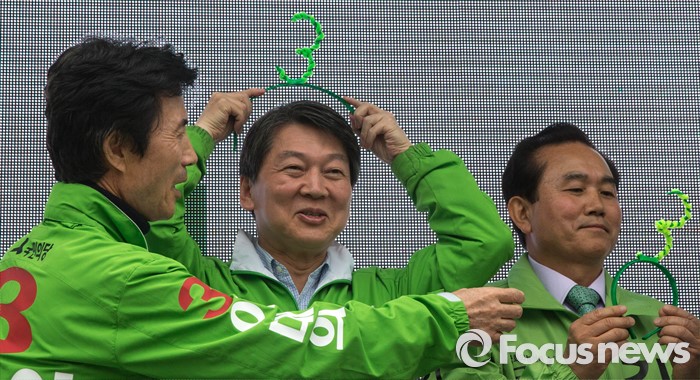(수원=포커스뉴스) 9일 오후 수원시 장안구 수원종합운동장에서 열린 국민의당 합동유세에 참석한 안철수 대표가 후보자들과 함께 3번이 새겨진 머리띠를 하고 있다.