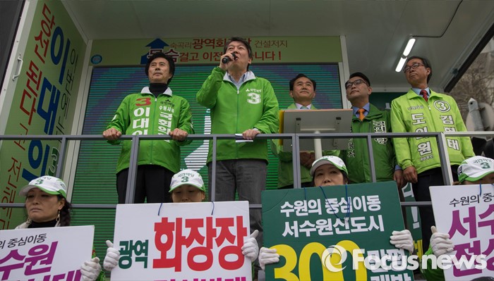 (수원=포커스뉴스) 9일 오후 수원시 장안구 수원종합운동장에서 열린 국민의당 합동유세에 참석한 안철수 대표가 시민들에게 지지를 호소하고 있다.