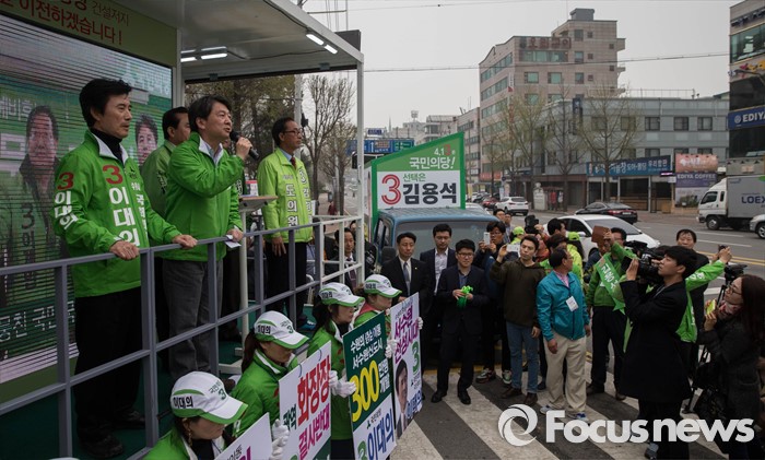 (수원=포커스뉴스) 9일 오후 수원시 장안구 수원종합운동장에서 열린 국민의당 합동유세에 참석한 안철수 대표가 시민들을 향해 지지를 호소하고 있다.