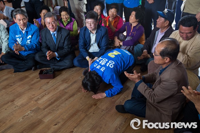 (광주=포커스뉴스) 양향자 더불어민주당 광주광역시 서구을 후보가 9일 오전 광주광역시 서구 발산마을회관에서 어르신들과 대화하던 중 큰절을 하고 있다.