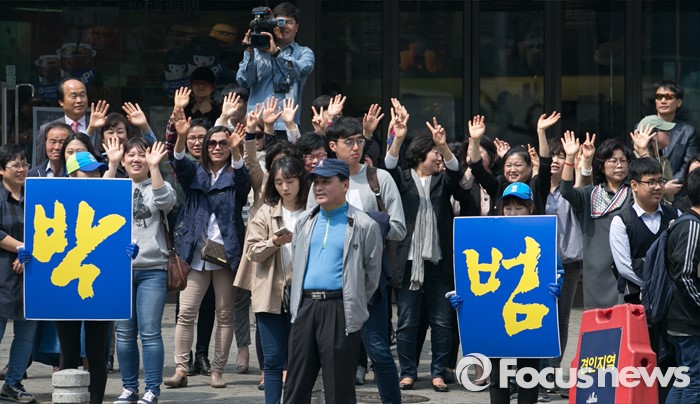 (대전=포커스뉴스) 9일 오후 대전 갤러리아백화점 타임월드점 앞에서 시민 및 지지자들이 더불어민주당 대전 서구 합동유세를 지켜보고