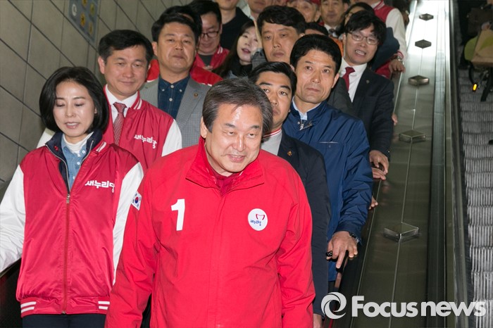 (성남=포커스뉴스) 제20대 국회의원 선거를 나흘 앞둔 9일 오후 성남시 분당구 야탑역 에스컬레이터에서 김무성(앞줄 오른쪽) 새누리당 대표가 시민들에게 지지를 호소하며 인사하고 있다.