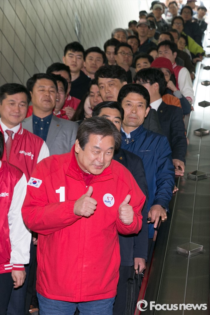 (성남=포커스뉴스) 제20대 국회의원 선거를 나흘 앞둔 9일 오후 성남시 분당구 야탑역 에스컬레이터에서 김무성(앞) 새누리당 대표가 시민들에게 지지를 호소하고 있다.