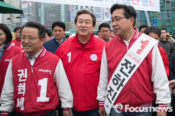 (성남=포커스뉴스) 제20대 국회의원 선거를 나흘 앞둔 9일 오후 성남시 분당구 야탑역 광장에서 김무성(가운데) 새누리당 대표가 권혁세(왼쪽) 분당갑, 전하진(오른쪽) 분당을 후보 지원유세에 참석하고 있다.