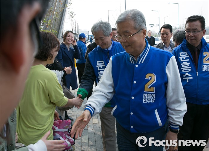 (세종=포커스뉴스) 9일 오후 세종시 국립세종도서관 앞에서 김종인(가운데) 더불어민주당 비대위 대표 겸 선대위원장과 문흥수(왼쪽) 세종시 후보가 선거유세에 앞서 시민 및 지지자들과 인사하고 있다.