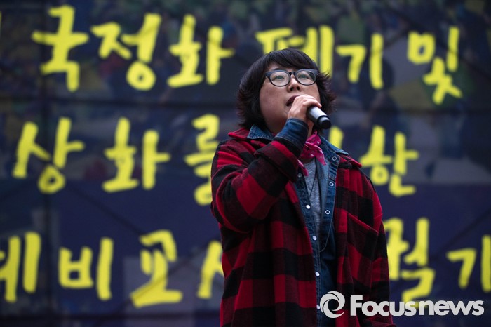 (서울=포커스뉴스) 9일 오후 서울 종로구 영풍문고 앞에서 열린 '한국사 국정화 교과서 폐기 및 공교육 정상화를 위한 전국 초등예비교사 총궐기' 집회에서 한 참가자가 발언을 하고 있다.