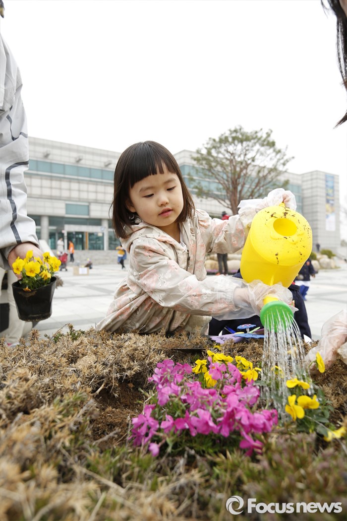 (서울=포커스뉴스) 9일 경기도 양주시 장흥문화예술회관에서 열린 '대한아토피협회와 함께하는 꽃나무 심는 날'에 참가한 어린이들이 꽃나무를 심고 있다. 이번 행사는 경기도 양주시 시설관리공단의 협조와 대유위니아, CJ제일제당, 에이치에스디, 에이플트리, 드올앤컴퍼니 등 기업들의 후원으로 진행됐으며, 정슬기의 마술쇼, 쿠키토이 티나(김민희 아나운서)의 재능기부도 이어졌다. <사진제공=대한아토피협회>