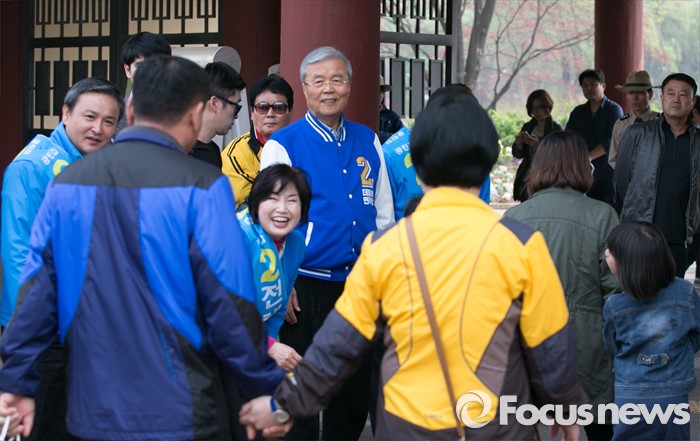 (서울=포커스뉴스) 김종인 더불어민주당 비대위 대표 겸 선대위원장과 전혜숙 광진갑 후보가 10일 오전 서울 어린이대공원 앞에서 나들이객들에게 인사하며 지지를 호소하고 있다.