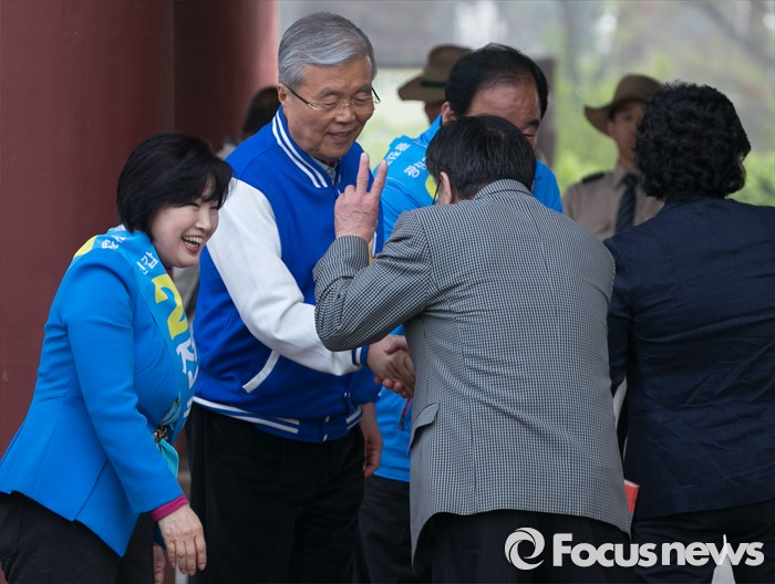 (서울=포커스뉴스) 김종인 더불어민주당 비대위 대표 겸 선대위원장과 전혜숙 광진갑 후보가 10일 오전 서울 어린이대공원 앞에서 나들이객들에게 인사하며 지지를 호소하고 있다.