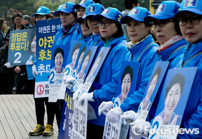(서울=포커스뉴스) 10일 오전 서울 어린이대공원 앞에서 전혜숙 더불민주당 광진갑 후보의 선거운동원들이 지지를 호소하고 있다.