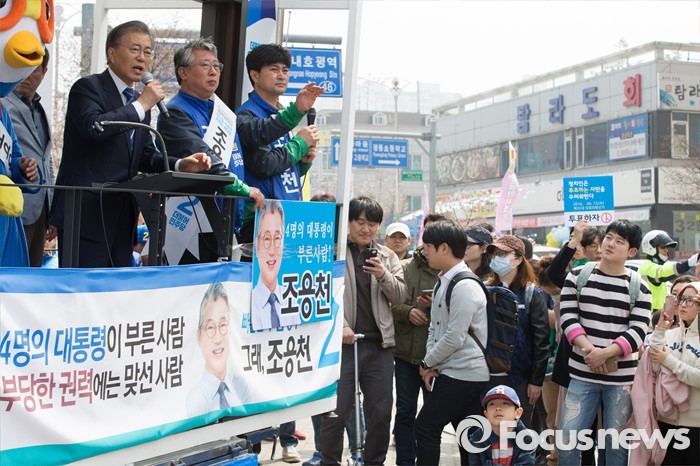 (남양주=포커스뉴스) 문재인 더불어민주당 전 대표가 10일 오전 경기도 이마트 남양주점 인근에서 조응천 더불어민주당 남양주갑 후보, 최민희 더불어민주당 남양주병 후보와 함께 유권자들에게 지지를 호소하고 있다.