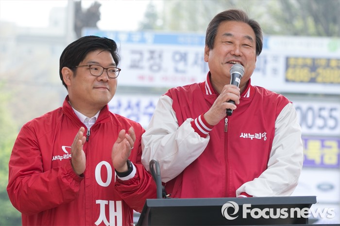 (서울=포커스뉴스) 김무성(오른쪽) 새누리당 대표가 10일 오전 서울 강동구 양재대로 둔촌시장 앞에서 이재영(왼쪽) 강동을 후보 지원유세를 하고 있다.