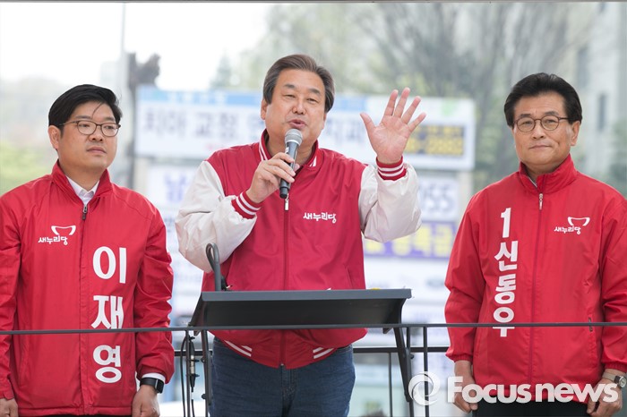 (서울=포커스뉴스) 김무성(가운데) 새누리당 대표가 10일 오전 서울 강동구 양재대로 둔촌시장 앞에서 이재영(왼쪽) 강동을 후보 지원유세를 하고 있다.