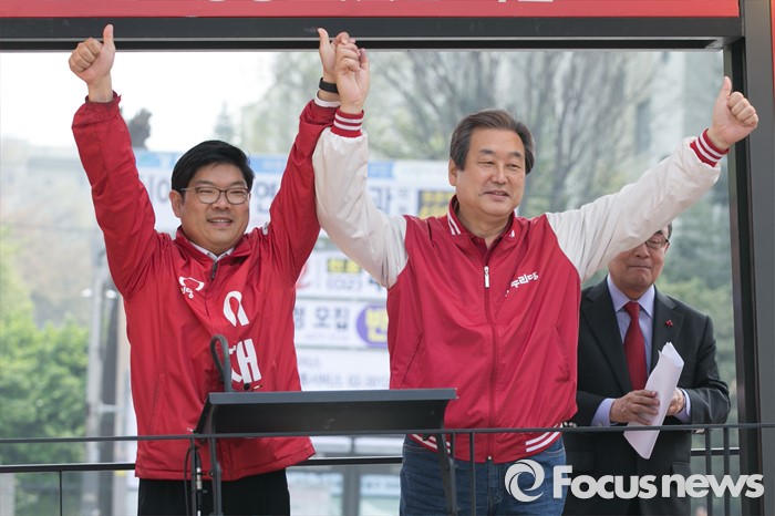 (서울=포커스뉴스) 김무성(오른쪽) 새누리당 대표가 10일 오전 서울 강동구 양재대로 둔촌시장 앞에서 이재영(왼쪽) 강동을 후보 지원유세를 하고 있다.