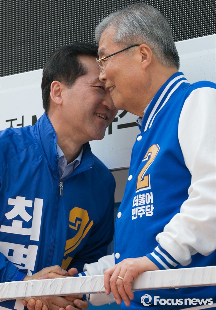 (서울=포커스뉴스) 김종인(오른쪽) 더불어민주당 비대위 대표 겸 선대위원장이 10일 오전 서울 석촌호수 서호 인근 거리에서 지원유세를 마친 뒤 최명길 송파을 후보와 악수하고 있다.