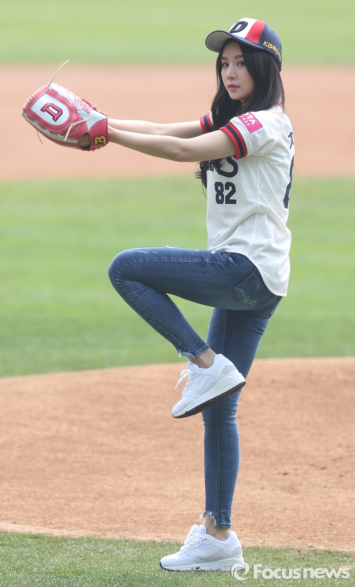 (서울=포커스뉴스) 10일 서울 잠실구장에서 열린 2016 프로야구 넥센-두산 경기에서 걸그룹 피에스타의 차오루가 시구하고 있다.