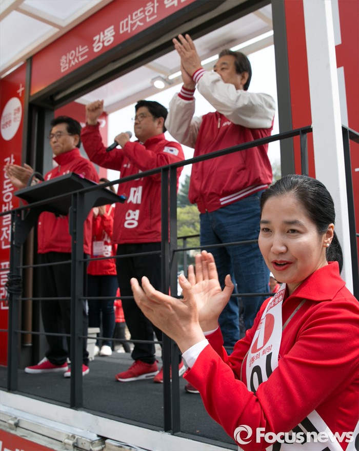(서울=포커스뉴스) 10일 오전 서울 강동구 양재대로 둔촌시장 앞에서 방송인 박정숙(앞) 씨가 남편 이재영 새누리당 강동을 후보 유세를 보며 박수치고 있다.