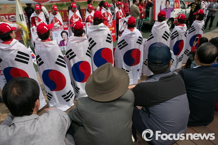 (서울=포커스뉴스) 10일 오전 서울 송파구 성내천 물빛광장에서 새누리당 선거운동원들이 태극기를 몸에 두르고 있다.