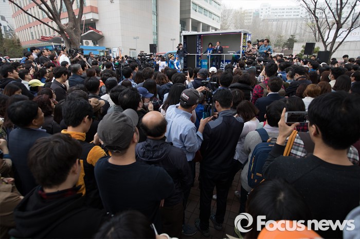 (서울=포커스뉴스) 문재인 더불어민주당 전 대표가 10일 오후 서울 마포구 홍익대학교 앞에서 손혜원 더불어민주당 마포을 후보의 지지를 호소하고 있다.