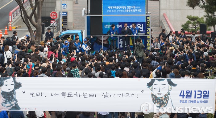 (서울=포커스뉴스) 문재인 더불어민주당 전 대표가 10일 오후 서울 마포구 홍익대학교 앞에서 손혜원 더불어민주당 마포을 후보의 지지를 호소하고 있다.